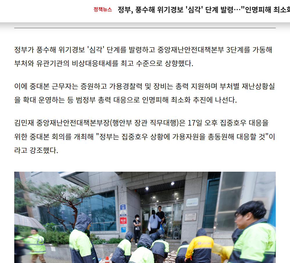 2025년 여름, 연이은 집중호우가 전국을 강타하면서 정부는 풍수해 위기경보 단계를 ‘경계’에서 최고 단계인 ‘심각’으로 격상했습니다. 기상청과 행정안전부는 호우특보가 내려진 지역뿐만 아니라 전국적 재난에 대비해 총력 대응에 나섰고, 인명피해 최소화를 위한 지자체·소방청·경찰청·국방부 등 범정부 협업체계가 본격 가동되었습니다.