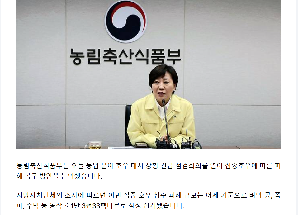 농식품부는 “사태가 완전히 수습될 때까지 관계기관과 협력해 1차 피해와 2차 피해(병해충·토양유실 등)까지 종합적으로 점검할 것”이라고 밝혔습니다.