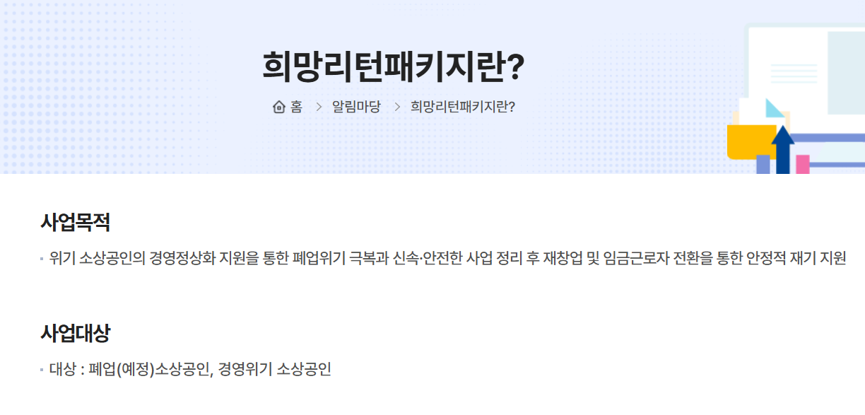 ‘소상공인 희망리턴패키지’는 폐업한 소상공인의 안정적인 사업정리와 재기(재취업 또는 재창업)를 도와주는 종합 프로그램입니다.