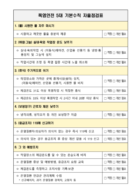 | 야외 근로자 | 건설, 농업, 배달 등 장시간 햇빛에 노출되는 직종은 의무적으로 쉴 시간과 수분을 확보해야 함. |