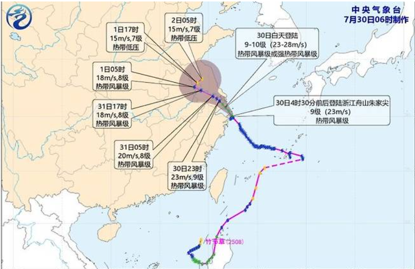 이후 30일 오후~31일 사이 중국 상하이 남남동쪽 약 70–190km 해상에 상륙할 것으로 예상되며,
