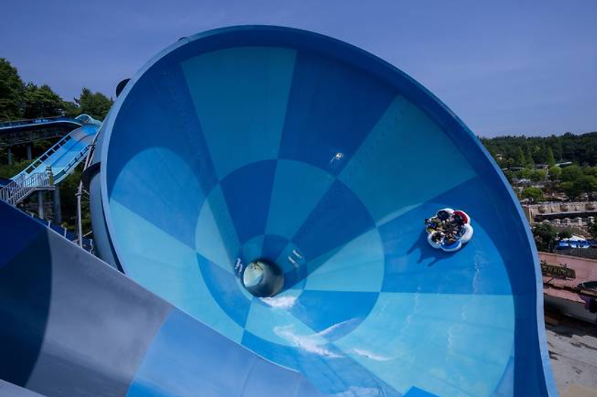 메가스톰: 캐리비안 베이의 시그니처 슬라이드. 거대한 원형 튜브를 타고 소용돌이 속으로 빠져드는 스릴을 경험할 수 있습니다.